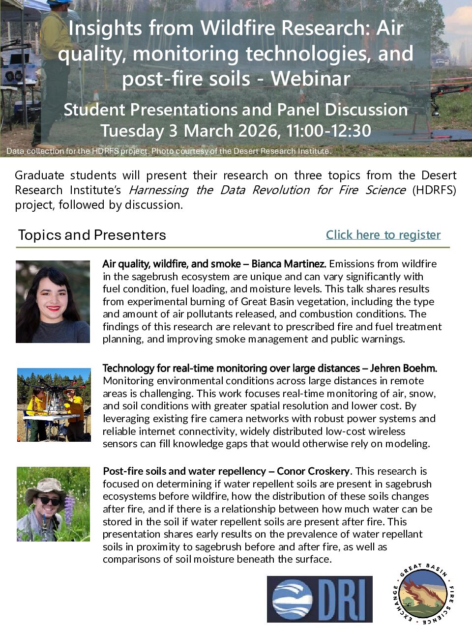 Hosted by the Great Basin Fire Science Exchange, this webinar features graduate researchers Bianca Martinez, Jehren Boehm, and Conor Croskery as they dive into:
